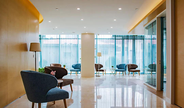 本項目簡約的玻璃式建筑給內部空間提供了與自然聯系的最佳條件,內部空間、外部建筑、自然環境形成了相互依存的關系。在該綜合門診的空間設計中,醫療公共活動區和診療區域都沿玻璃幕墻展開規劃,希望可以最大限度地讓患者感受到四季更替所帶來的空間變化,以及晝夜交織的光影幻化給空間帶來的無窮魅力。在室內空間中,用自然來做設計,能夠創造出任何裝飾設計無法達到的精彩。