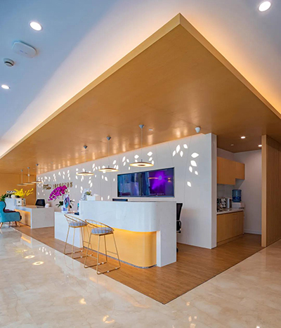 整個門診部空間以簡約的直線條形式傳達出與建筑一致的形體語言,時尚的配色既年輕又溫馨,符合各年齡群患者的審美。天然石材與大面積原木色的運用,讓患者更能體驗到與自然肌理的接觸。