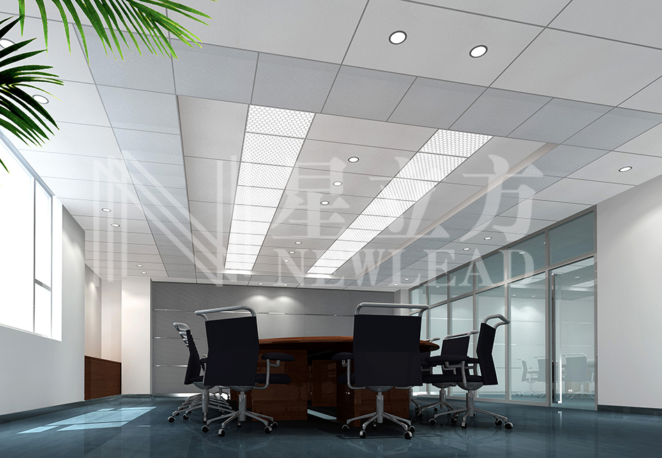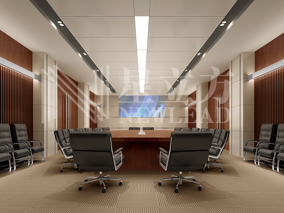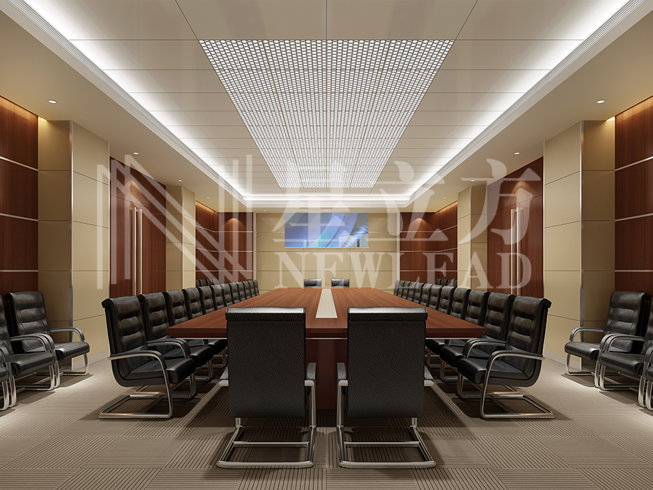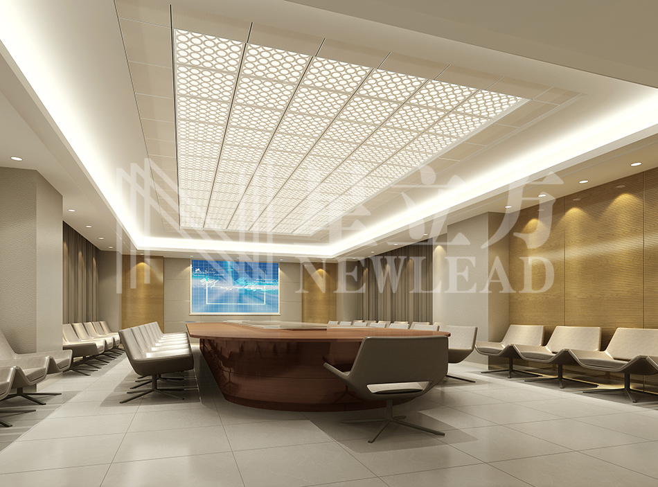 會議室應用,條板系列和格柵系列以及條板與燈槽的組合應用,提升會議空間的層高。生態硅晶板的每立方厘米1500個的負離子發生功能,讓與會人員猶如置身于森林之中。