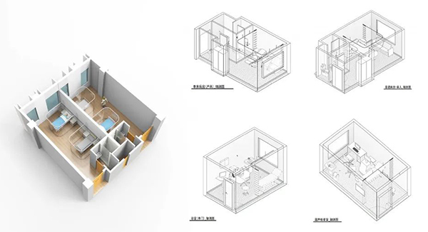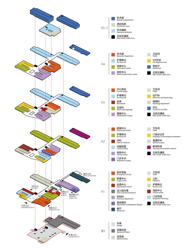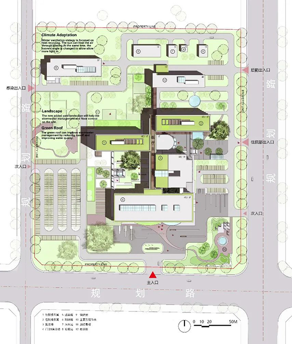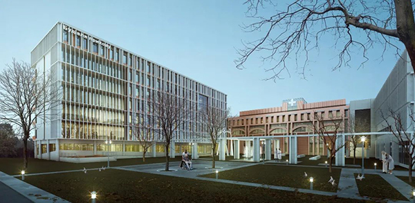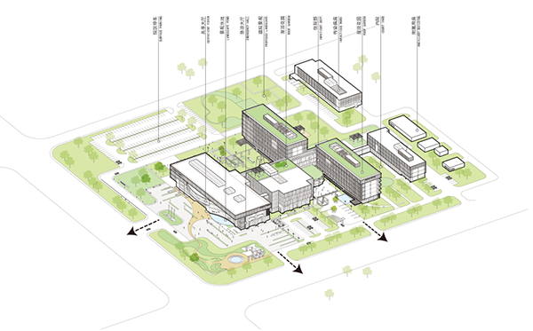 建筑設計同時在東西的兩個病房樓,北側辦公樓醫技樓的局部設計了屋頂花園,方便醫患病人和工作人員的季節性使用。同時,主街長廊的頂層被定義為“康復街區”,形成傳統街道效果,起到放松心情的作用。