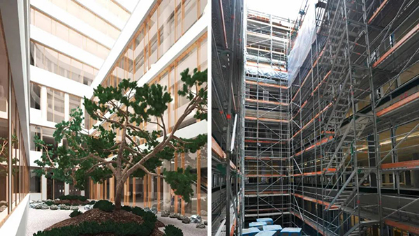 Nickl & Partner利用 KSB新巴登州立醫院的地理優勢及其自然環境,讓新建筑與景觀和森林和諧地融合在一起。入口處的樹木和綠植能夠帶給患者和訪客一種賓至如歸的感覺,這是“治愈性建筑”的一個重要方面。大樓入口采用大面積挑檐形式,為了使其達到無支柱設計,在建設階段需要穩定的鋼結構。圖中巨大的紅色框架柱將在施工中起到重要支撐作用,在完成施工后將會“功成身退”,最終呈現的效果如下方左側所示。