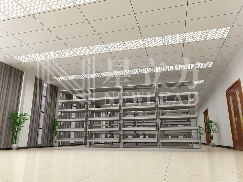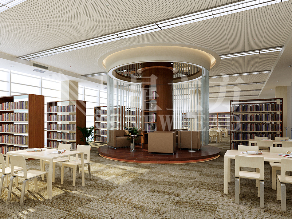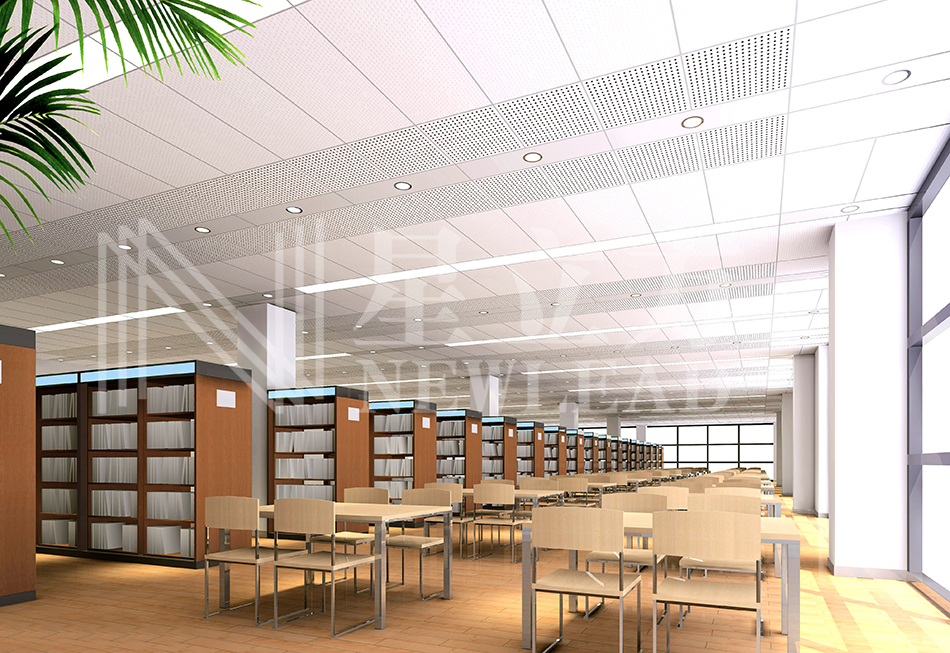 學(xué)校圖書閱覽室,大孔格柵和跌級(jí)龍骨的組合應(yīng)用,配套燈具散發(fā)的柔和光線