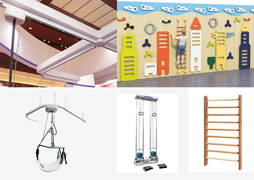 此類設(shè)備需要牢固的房頂或墻面進(jìn)行固定,如天軌、懸吊架、墻式拉力器、墻式肩梯、墻式肋木、兒童攀爬墻及訓(xùn)練用籃球架等。天軌安裝對于建筑的要求較高,其軌道底部到地面高度需在2.8~3m之間,另外天花吊頂?shù)缴厦娆F(xiàn)澆混凝土樓板之間的距離在1.5m內(nèi)。在康復(fù)醫(yī)療中心規(guī)劃初期,應(yīng)做充分調(diào)研,也可邀請相關(guān)設(shè)備廠商協(xié)助,輔助進(jìn)行安裝評估及軌道規(guī)劃。