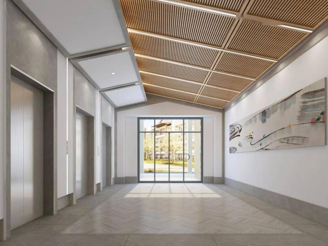 三號樓門廳的設(shè)計(jì)結(jié)合了三號樓建筑坡屋頂?shù)臈l件,將室內(nèi)吊頂設(shè)計(jì)成斜面,對空間進(jìn)行了有效利用,使其更加寬敞明亮,構(gòu)成了獨(dú)一無二的空間體驗(yàn)。透過主入口的蘇州特色月亮門,可以讓人感受到內(nèi)庭院搖曳的竹林和光線的變化。地面材質(zhì)與拼接方式也提取自園林局部,背景墻則利用材質(zhì)本身的肌理,展現(xiàn)了地域性的空間氛圍。